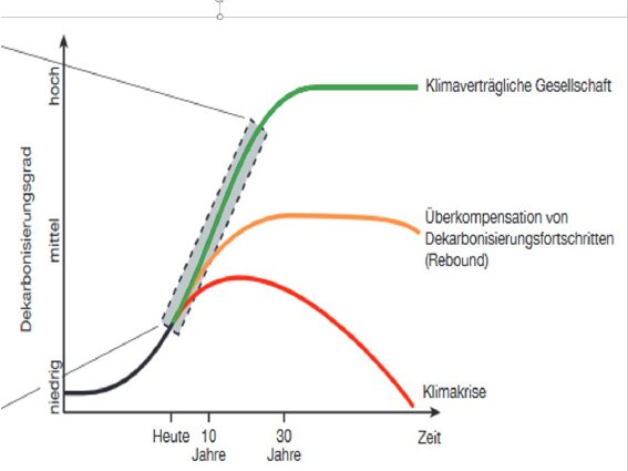 Stattdessen sind u. a. Rebound Effekte zu erwarten, die der durch Überkompensation angestrebten Dekarbonisierung diametral entgegenstehen (siehe Graphik rechts). Folge: Es wird nicht weniger, sondern mehr schädliche Energie freigesetzt.