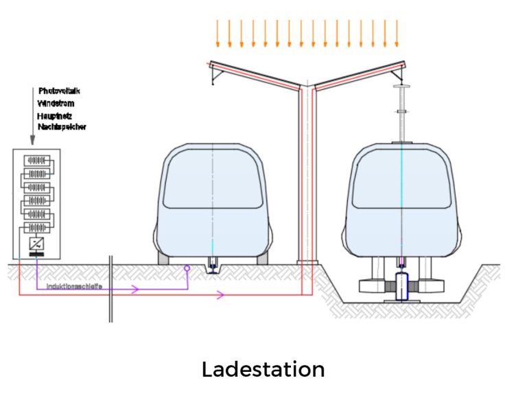 Die monorail braucht keine Oberleitung. Sie kann in Batterietechnik und in Kombination mit z.B. NaS-Großakkuspeicher für Solar- und Windenergie als eigenes und autarkes Netz für erneuerbare Energiequellen gestaltet und überwacht werden.