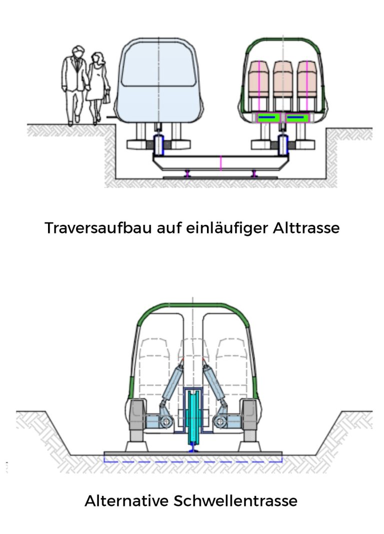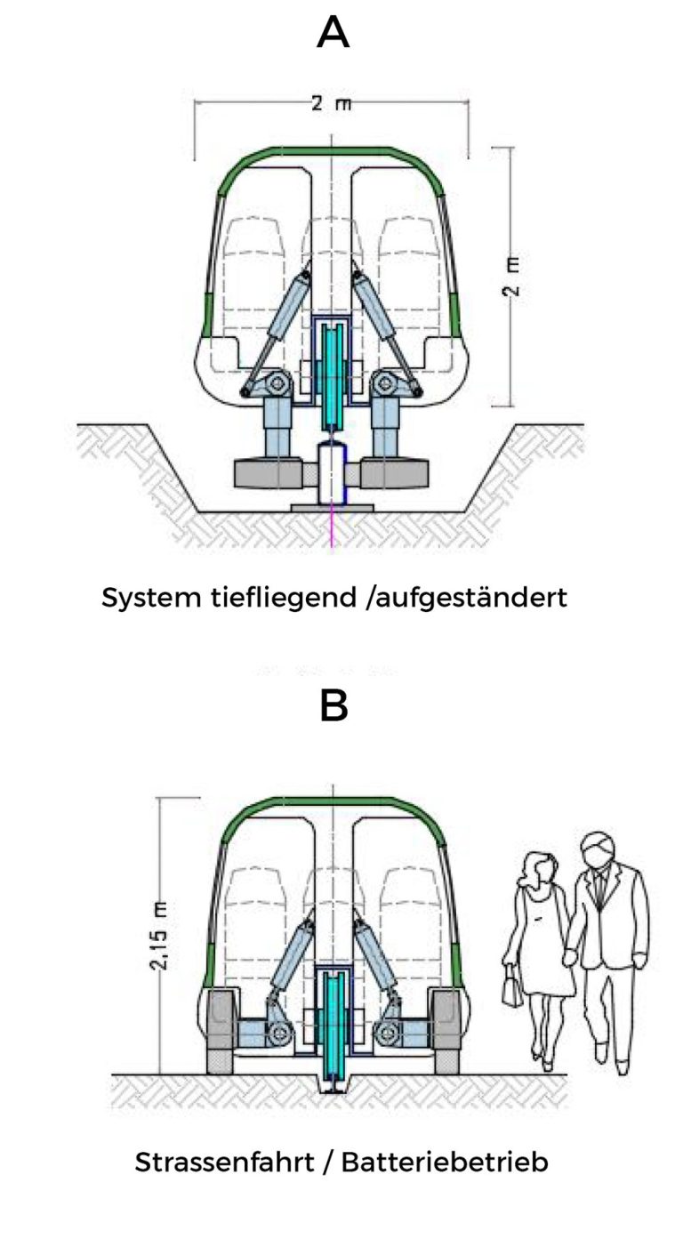 Durch das Zusammenwirken der interaktiven Schwerpunktstabilisation mit den verstellbaren elektrohydraulisch betätigten Radnabenantrieben können die Fahrzeuge sowohl straßengängig (Abb. B) als auch über ein Tragschienensystem (Abb. A) bewegt werden. Die Übertragung der Traktionskräfte erfolgt dabei über spezielle Kontaktlaufräder, die je nach Bedarf und Gegebenheiten (fahren, rollen, steigen, bremsen usw.) automatisiert angepasst und überwacht werden. Die Fahrzeuge selbst können bedarfsgerecht und nach den jeweiligen Einsatzbedingungen komfortabel und barrierefrei konzipiert werden.