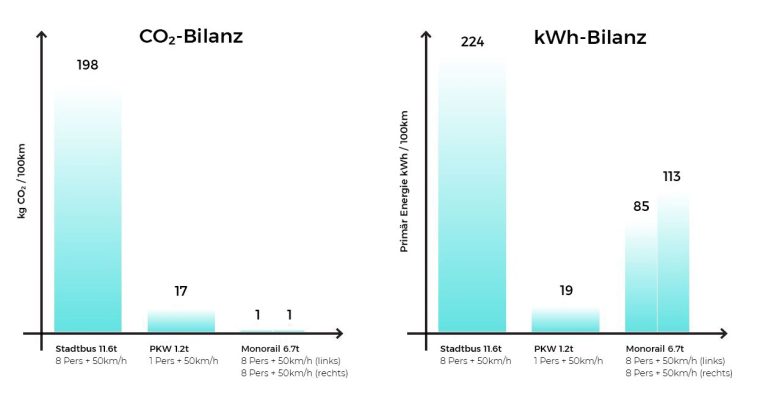 Mit der Wechselwirkung von Lastbewegung über Schiene und getrennter Traktion über die einstellbaren elektrischen Antriebe, werden sowohl die energetischen Vorteile des Schienentransports wie auch die Anpassung an geographische Gegebenheiten möglich. Die monorail ist deshalb auch in hügeligem Gelände betriebssicher einsetzbar. Das modulare und platzsparende Design ermöglicht somit eine nahtlose Integration in städtische Umgebungen und trägt mit strategisch platzierten Umsteigepunkten deutlich zur Verringerung der Verkehrsdichte bei.